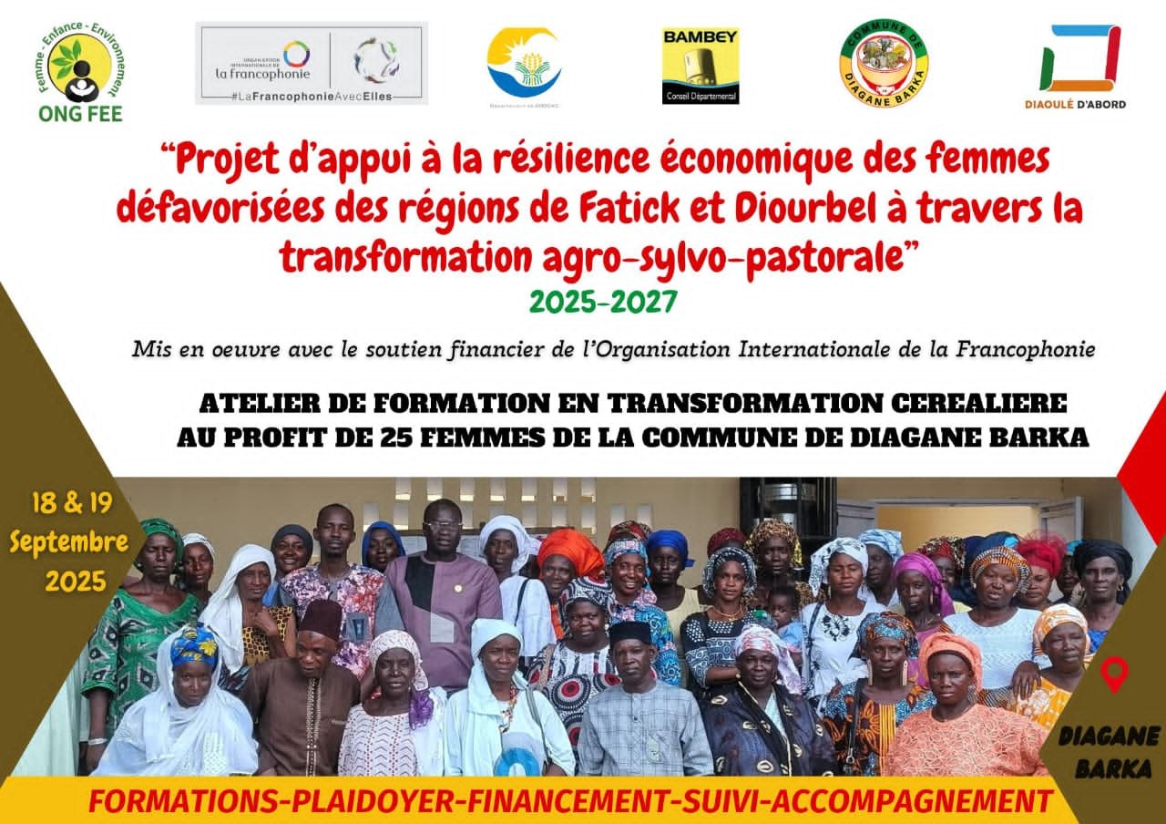 Ce vendredi 19 septembre 2025, Monsieur Mabousso DIALLO, Maire de Diagane Barka, a présidé la cérémonie de clôture de l’atelier de formation en transformation céréalière au profit de 25 femmes de la commune.